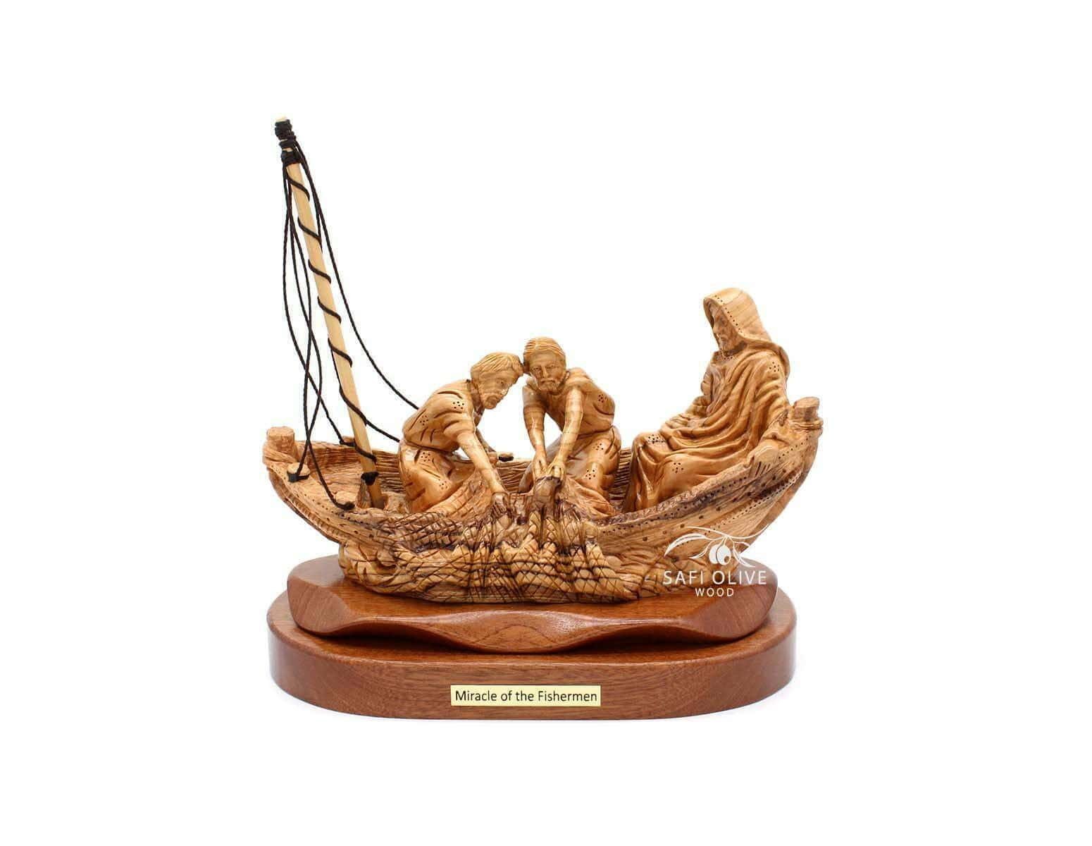 Este precioso Milagro del Pescador está tallado a mano en Tierra Santa con auténtica madera de olivo de Belén, recolectada de forma sostenible. Esta preciosa estatua del Milagro del Pescador está hecha a mano con madera de olivo de un árbol que crece en Tierra Santa desde hace cientos de años. Un objeto significativo porque procede directamente de Tierra Santa.