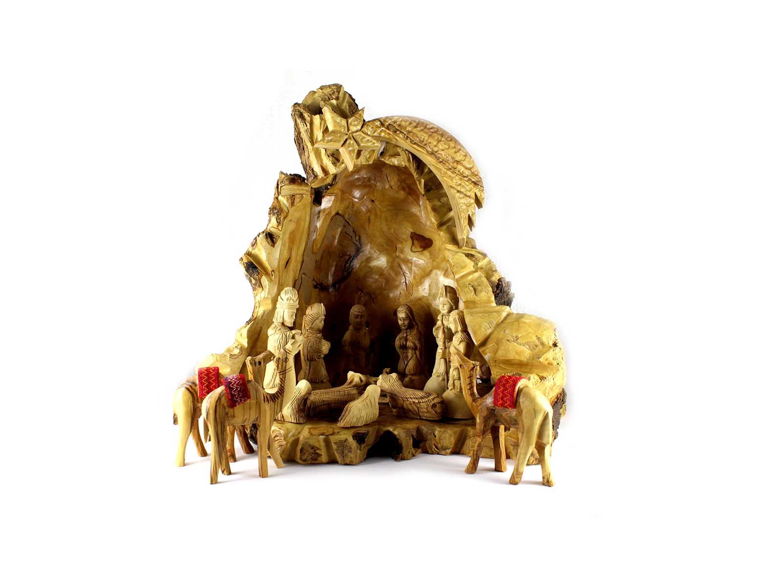 Tämä kaunis, ainutlaatuisella talliosalla varustettu joulupuu on valmistettu käsityönä Pyhässä maassa kestävästi kerätystä, aidosta Betlehemin oliivipuusta. Tässä käsintehtyyn kappaleeseen on käytetty ainoastaan Pyhältä maalta peräisin olevia, ei-tuotannollisia oliivipuita, ja se paljastaa raa’an oliivipuun upeat raekuviot ilman lisäaineita tai tiivistysaineita. Hahmoihin kuuluvat Maria ja Joosef sekä Jeesus, kolme tietäjää ja pieni paimenpoika. Eläimiin kuuluvat aasi, lehmä, kaksi karitsaa ja kolme kamelia. Se on kauniisti muotoiltu, ja se sopii erinomaisesti joulun juhlan keskeiseksi teemaksi.