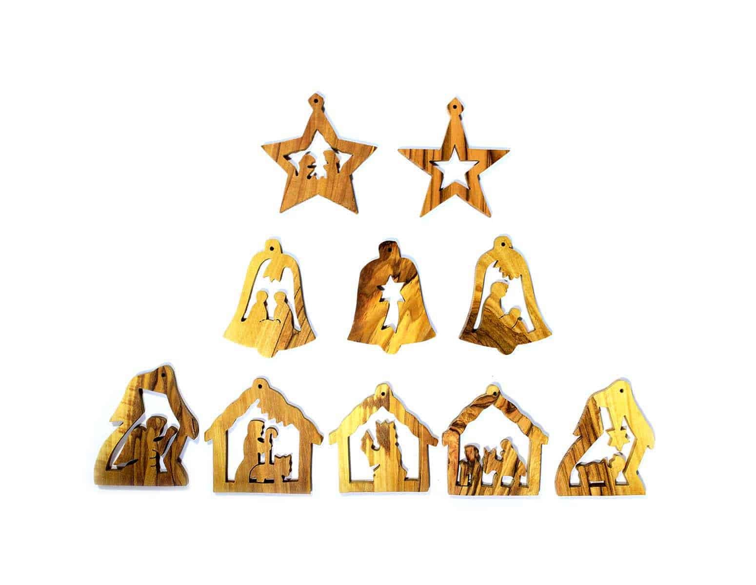 Diverse platte kerstornamenten worden handgemaakt in het Heilige Land van duurzaam geoogst, authentiek Bethlehem Olivewood. Geweldig cadeau en decoratie voor uw kerstboom.