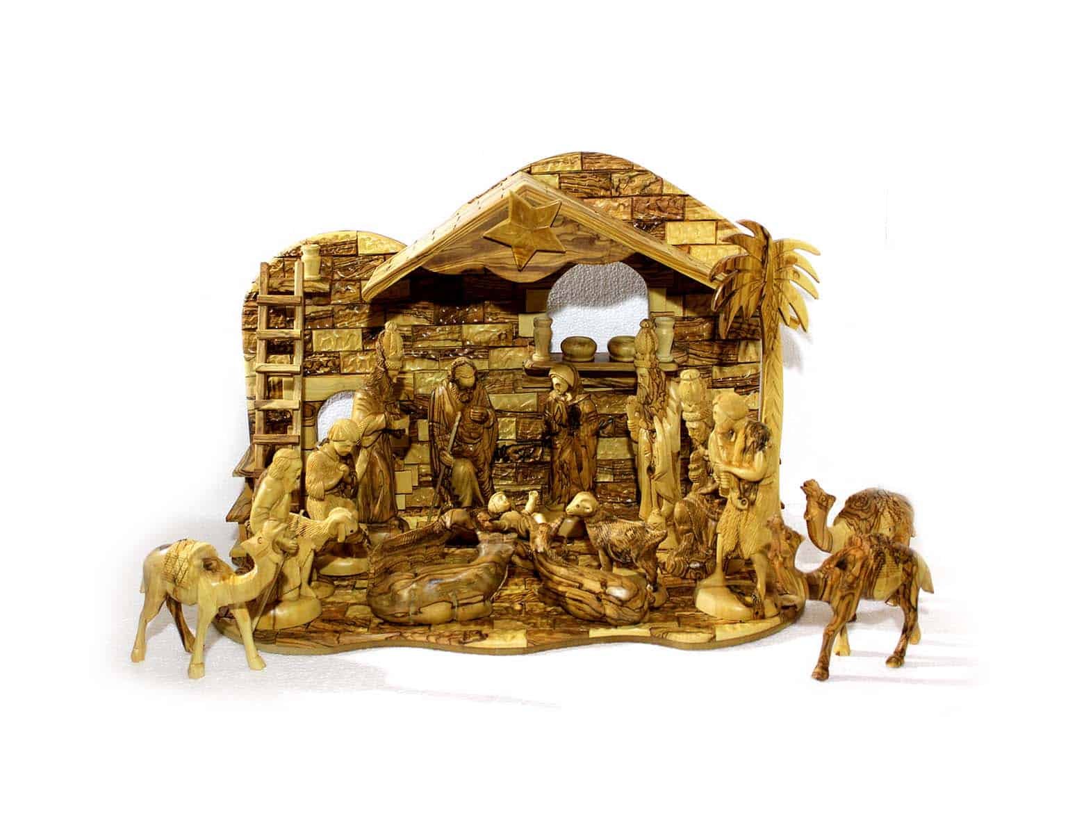 Dette vakre julekrybbesettet er håndlaget i Det hellige land av bærekraftig høstet, autentisk Bethlehem Olivewood. Ved å bruke kun ikke-produktive oliventrær fra Holy Land, avslører dette håndlagde stykket de fantastiske kornmønstrene til rå oliventre, fri for tilsetningsstoffer eller fugemasse. Figurene inkluderer Maria og Josef og Jesus, de tre vise menn og tre gode hyrder. Dyrene inkluderer eselet, storfekua og tre lam og tre kameler. Dette komplette settet kommer med en sammenleggbar stall av oliventre og Silent Night-musikalen.