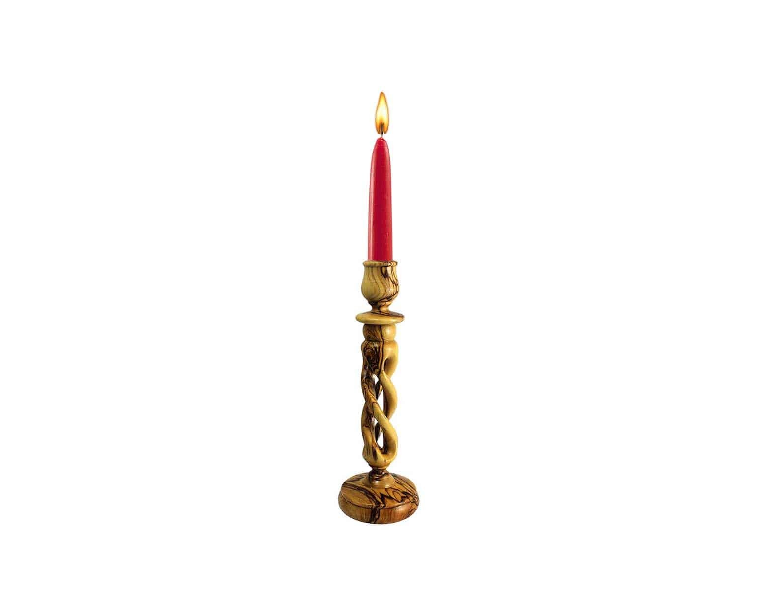 This beautiful hallow twist candlestick is handmade in the Holy Land from sustainably harvested, authentic Bethlehem Olivewood. The rich color is characteristic of the beautiful Bethlehem Olive Wood. This delightfully carved candlestick fits a regular taper candle and it makes a beautiful addition to any dining table or mantelpiece.