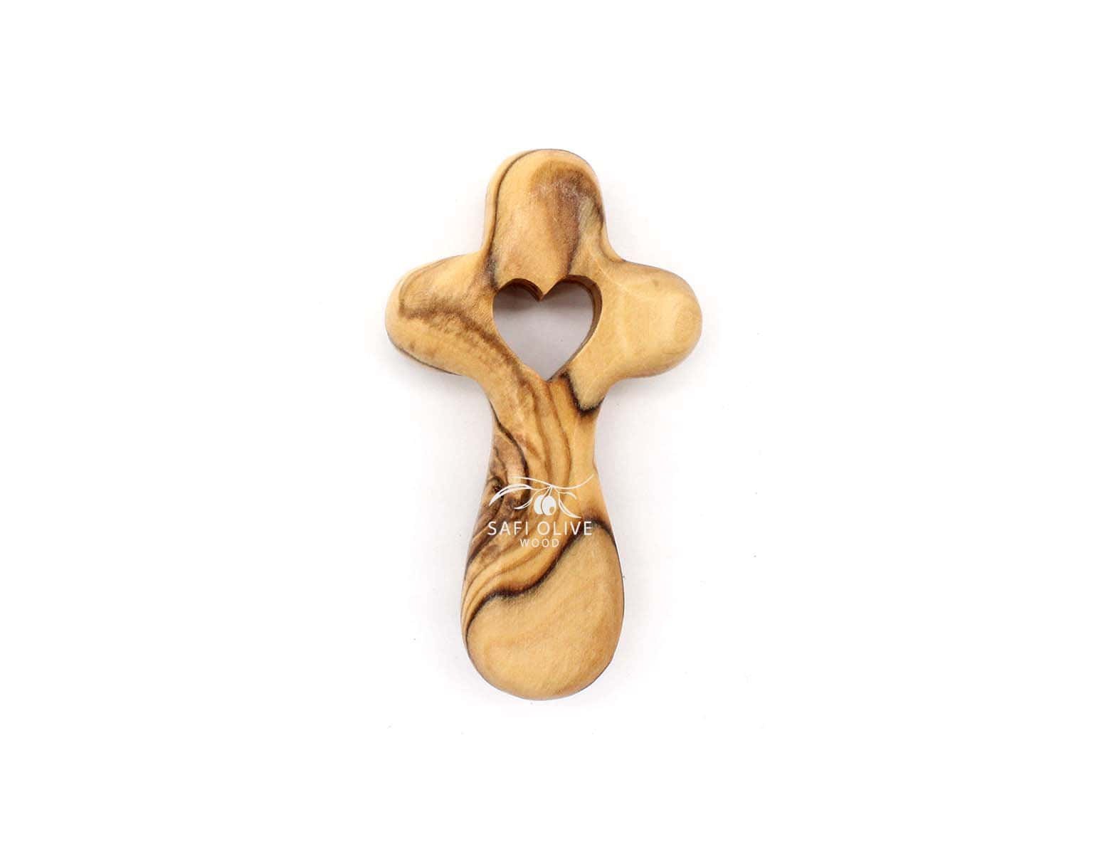 This beautifully hand-carved olive wood comfort holding cross features a heart delicately carved in the center, symbolizing love and faith. Crafted from authentic Bethlehem olive wood, the cross is designed to be held in the hand, offering comfort during prayer, meditation, or moments of reflection. It also makes a meaningful gift for loved ones.