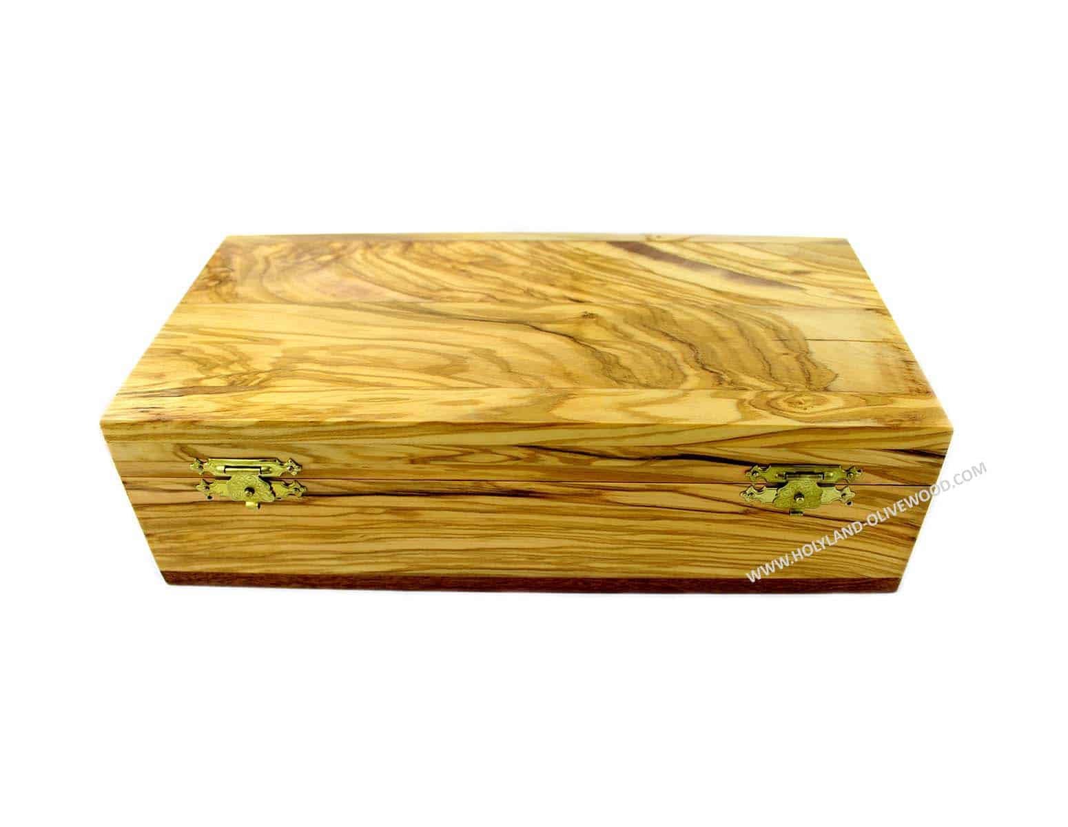 Denna eleganta smyckeskrin är handgjord i det heliga landet från hållbart skördad, autentisk Betlehem Olivewood. Träet som användes för att göra denna låda var handplockat för att säkerställa ett rikt, kontrasterande kornmönster. Den har också robusta dekorativa lås, en inlagd spegel, olivträdelare, svart filtfoder och en solid mahognybas.
