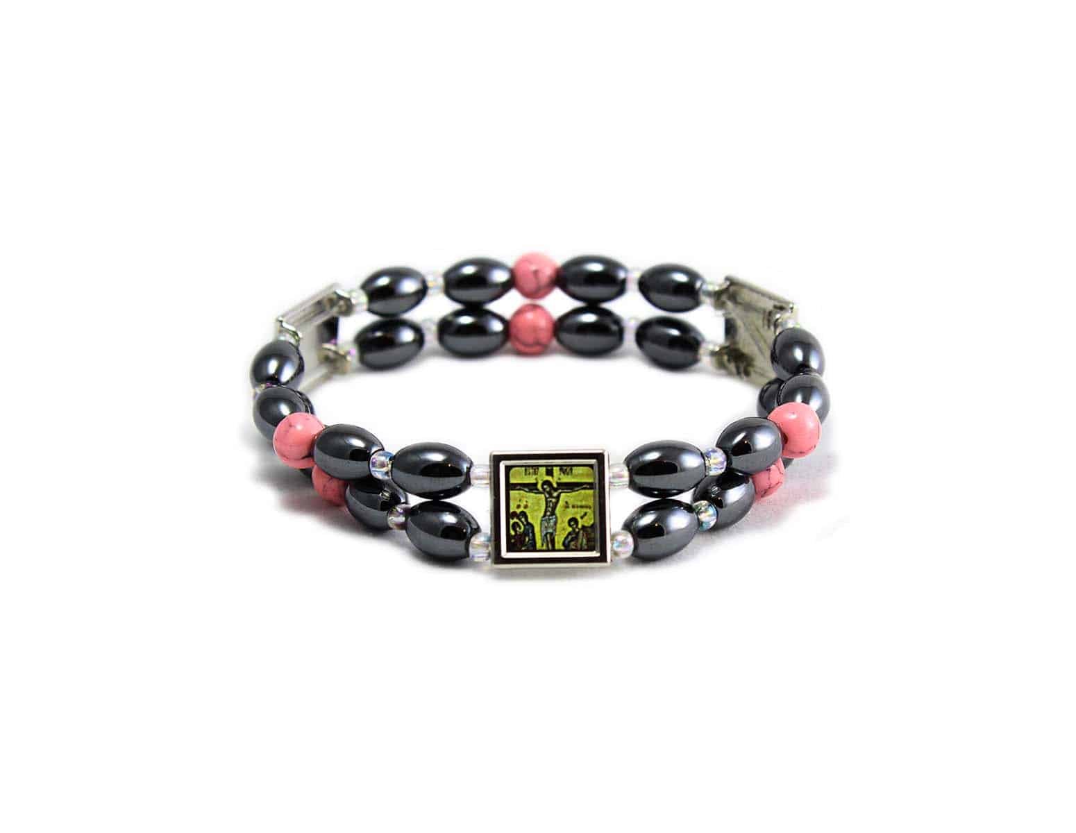 Detta radband är handgjort i holy land staden Betlehem av helande hematit sten och rosa korall. Den är elastisk och passar lätt på vilken handled som helst. Armbandet levereras med 3 silverpläterade charm.
