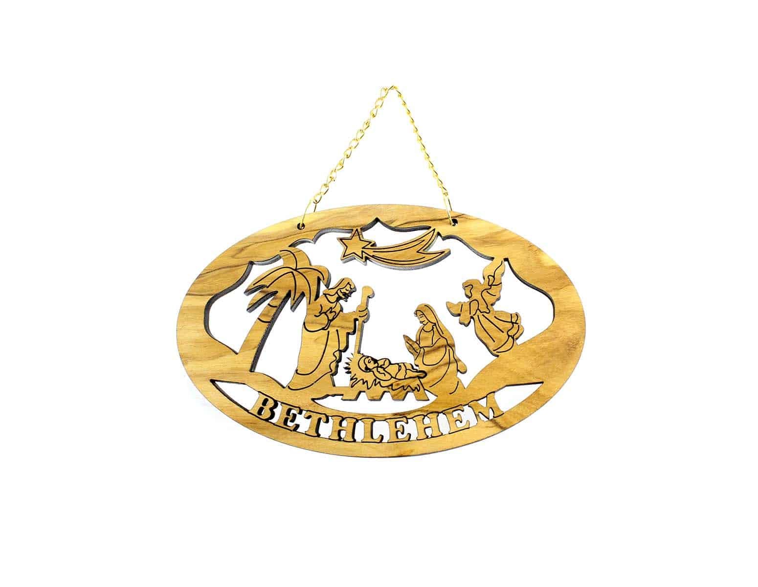 Denna vackra plakett är gjord i det heliga landet av hållbart skördad, autentisk Betlehem Olivewood. En mycket elegant och högkvalitativ olivträ som hänger på väggen “Betlehem” hemvälsignelse. Den laserskurna ovala plaketten föreställer ordet Betlehem med en julscen. Lackerade.